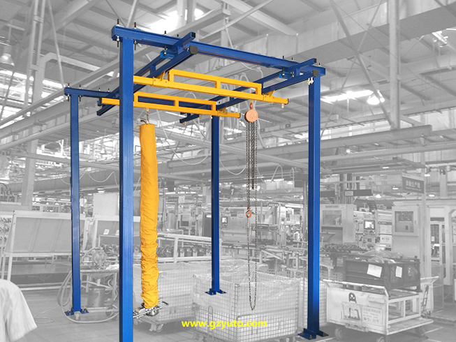軌道起重機 懸掛式軌道有架式鋼軌和全鋁合金軌道供選擇, 可節省地面空間, 與真空搬運機配合使用, 能夠在大范圍內移動。 自立式軌道的4根立柱立于地面上, 桁架式軌道與懸掛式相同 。 各種長度尺寸可定制, 大小規格供選擇。