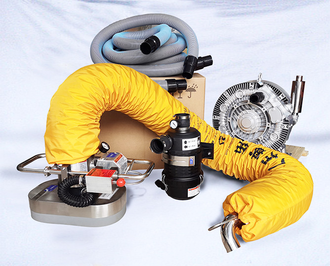 提升管總成, 包括控制器及手柄總成、提升管和頂部旋轉器總成,其中頂部旋轉器總成可360°旋轉;內置單向閥,當突然斷電或真空泄露時,感應器啟動, 阻止真空進一步泄露。重物緩慢降落至地面。 彎頭采用圓弧過渡設計,減少空氣阻力,加速空氣流動, 在伸縮管內快速形成真空, 設備反應更加靈敏。彎頭采用304材質, 端蓋采用鋁合金, 旋轉體采用PE材質, 三種材質完美結合, 強度高,重量輕。